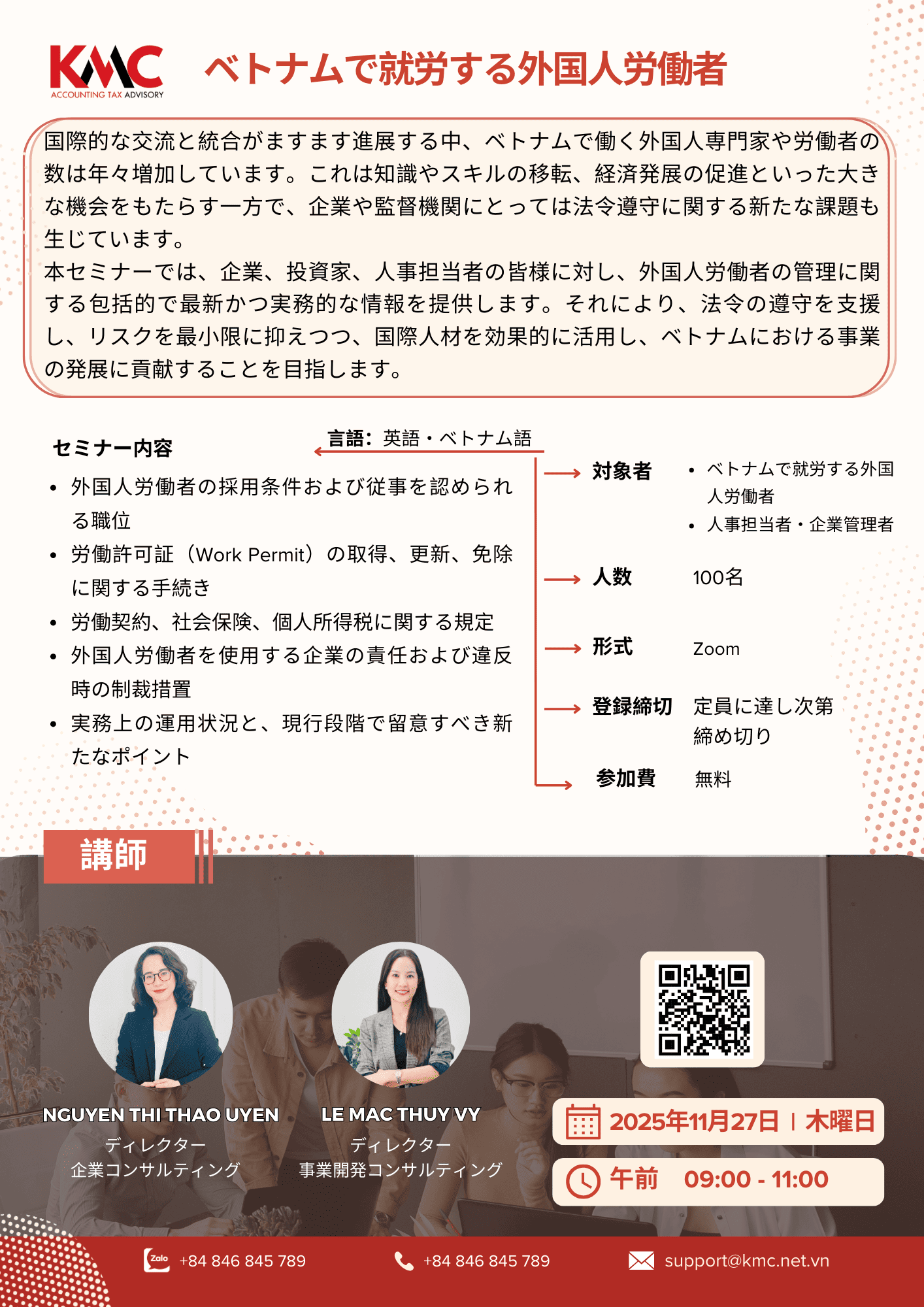 セミナー 2025年11月27日 | ベトナムで就労する外国人労働者 KMC Consulting Company Limitedによって 国際的な交流と統合がますます進展する中、ベトナムで働く外国人専門家や労働者の数は年々増加しています。これは知識やスキルの移転、経済発展の促進といった大きな機会をもたらす一方で、企業や監督機関にとっては法令遵守に関する新たな課題も生じています。本セミナーでは、企業、投資家、人事担当者の皆様に対し、外国人労働者の管理に関する包括的で最新かつ実務的な情報を提供します。それにより、法令の遵守を支援し、リスクを最小限に抑えつつ、国際人材を効果的に活用し、ベトナムにおける事業の発展に貢献することを目指します。 セミナーの内容 外国人労働者の採用条件および従事を認められる職位労働許可証(Work Permit)の取得、更新、免除に関する手続き労働契約、社会保険、個人所得税に関する規定外国人労働者を使用する企業の責任および違反時の制裁措置実務上の運用状況と、現行段階で留意すべき新たなポイント 言語: 英語・ベトナム語 2025年11月27日 | 木曜日 午前: 09:00 - 11:00 登録 内容 講師 Nguyen Thi Thao Uyen 氏ディレクター企業コンサルティング Le Mac Thuy Vy 氏ディレクター事業開発コンサルティング 対象者 ベトナムで就労する外国人労働者 人事担当者・企業管理者 人数 100名 形式 Zoom 締め切り 定員に達し次第 締め切り 参加費 無料