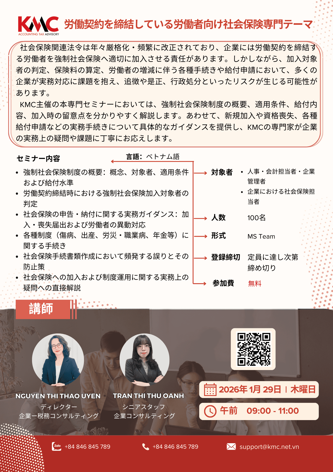 KMC主催の本専門セミナーにおいては、強制社会保険制度の概要、適用条件、給付内容、加入時の留意点を分かりやすく解説します。あわせて、新規加入や資格喪失、各種給付申請などの実務手続きについて具体的なガイダンスを提供し、KMCの専門家が企業の実務上の疑問や課題に丁寧にお応えします。
