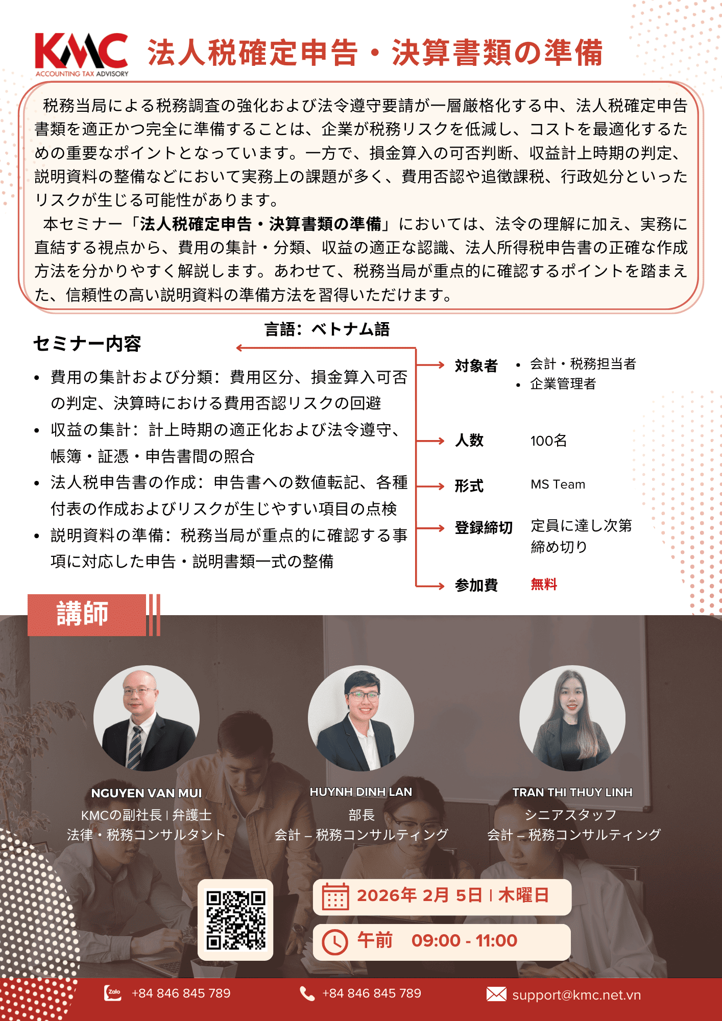 セミナー 2026年2月5日 | 法人税確定申告・決算書類の準備 KMC Consulting Company Limited によって 税務当局による税務調査の強化および法令遵守要請が一層厳格化する中、法人税確定申告書類を適正かつ完全に準備することは、企業が税務リスクを低減し、コストを最適化するための重要なポイントとなっています。一方で、損金算入の可否判断、収益計上時期の判定、説明資料の整備などにおいて実務上の課題が多く、費用否認や追徴課税、行政処分といったリスクが生じる可能性があります。本セミナー「法人税確定申告・決算書類の準備」においては、法令の理解に加え、実務に直結する視点から、費用の集計・分類、収益の適正な認識、法人所得税申告書の正確な作成方法を分かりやすく解説します。あわせて、税務当局が重点的に確認するポイントを踏まえた、信頼性の高い説明資料の準備方法を習得いただけます。 セミナーの内容 費用の集計および分類:費用区分、損金算入可否の判定、決算時における費用否認リスクの回避収益の集計:計上時期の適正化および法令遵守、帳簿・証憑・申告書間の照合法人税申告書の作成:申告書への数値転記、各種付表の作成およびリスクが生じやすい項目の点検説明資料の準備:税務当局が重点的に確認する事項に対応した申告・説明書類一式の整備 言語: ベトナム語 2025年2月5日 | 木曜日 午前: 09:00 - 11:00 登録 内容 講師 Nguyen Van Mui 氏KMCの副社長 | 弁護士 法律・税務コンサルティング Huynh Dinh Lan 氏部長会計 - 税務コンサルティング Tran Thi Thuy Linh 氏シニアスタッフ会計 - 税務コンサルティング 対象者 会計・税務担当者 企業管理者 人数 100名 形式 MS Team 締め切り 定員に達し次第 締め切り 参加費 無料