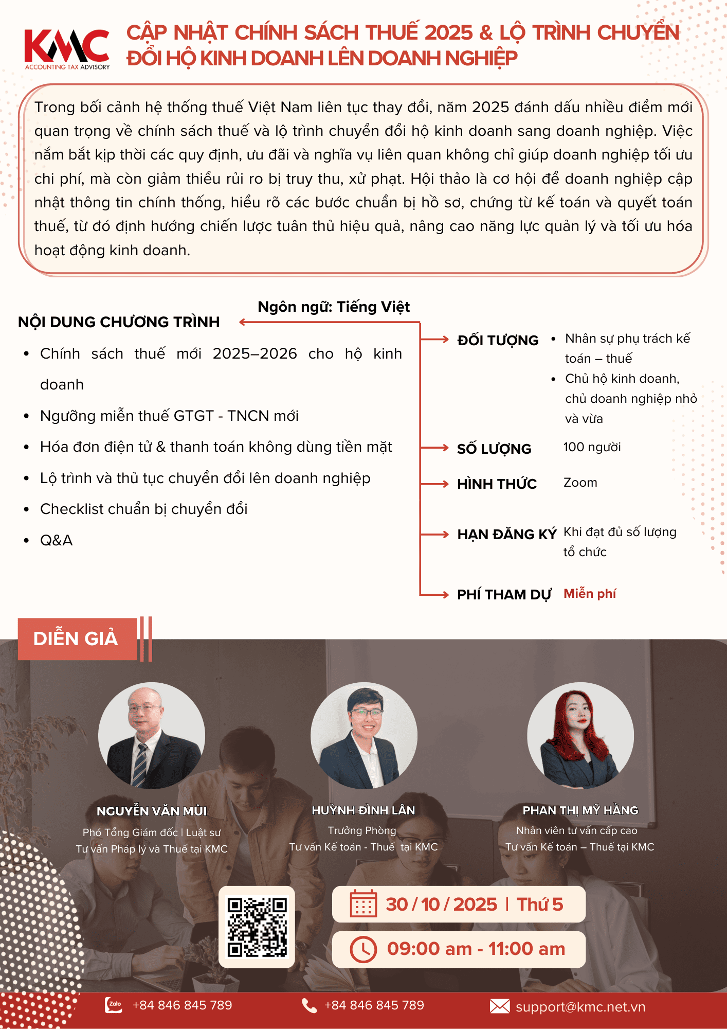 30.10.2025 | CẬP NHẬT CHÍNH SÁCH THUẾ 2025 & LỘ TRÌNH CHUYỂN ĐỔI HỘ KINH DOANH LÊN DOANH NGHIỆP